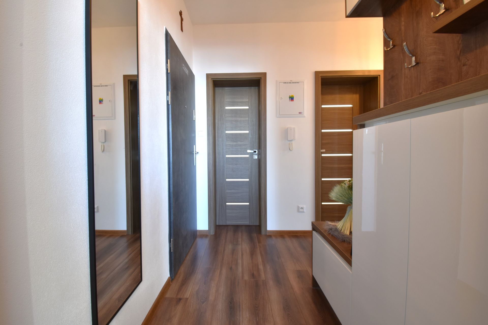 Veľká obývacia časť spojená s kuchyňou, špajza, loggia, izba, spálňa s veľkou vstavanou skriňou, wc sólo a kúpeľňa s toaletou. Bezpečnostné vchodové dvere + video vrátnik. V celom byte je podlahové kúrenie. Pivnica na prízemí.